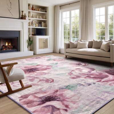Comeet Floral 5×7 Washable Rug – Low Pile Boho Non-Slip Carpet for Living Room, Bedroom, Kids & Pets, Purple