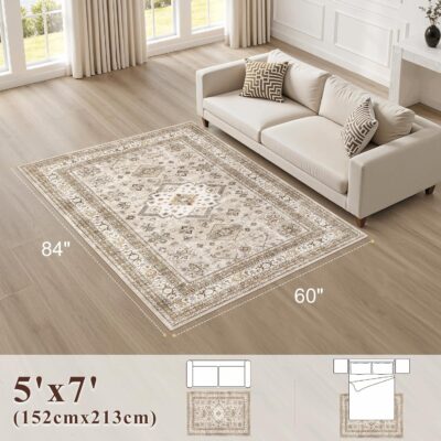 Vintage 5×7 Area Rug – Soft Washable Oriental & Farmhouse Carpet for Living Room, Bedroom, Home Office, Beige