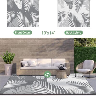 GENIMO Reversible Outdoor Rug 10×14 – Waterproof Patio, RV, Camping & Picnic Mat, Grey & White Palm Leaf Design