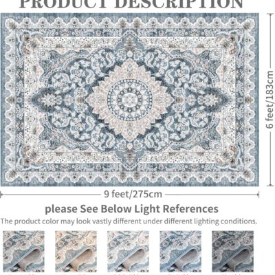 Foxmas 6×9 Machine Washable Area Rug – Vintage Low Pile Non-Slip Carpet for Living Room, Bedroom, Kitchen, Dining Room, Blue
