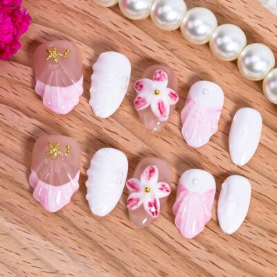 Summer Flower Press-On Nails 10Pc – Short Almond Gold Shell & Starfish Reusable Nails