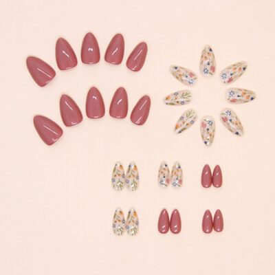 Short Almond Floral Press-On Nails – Full-Cover Fall Glue-On Fake Nails for Women